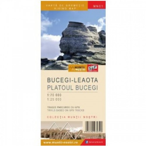 Harta turistica detaliata si complexa a Muntilor Bucegi Leaota. Harta s-a editat folosind cele mai actuale tehnici de cartografiere şi s-a tiparit pe hartie rezistenta la umiditate. Este uşor de citit şi simplu de utilizat datorita stilurilor de reprezentare cartografice şi datorita structurarii practice ale informaţiilor. Totul este la indemana, exact acolo unde este necesar, fiind utila atat pasionaţilor de drumeţii cat şi profesioniştilor. Platoul Bucegi apare la o scara mai detaliata: 1 : 25 000. Toate traseele au fost parcurse pe teren cu GPS-ul. Acestea sunt descrise in detaliu in limbile romana şi engleza, unele trasee avand ataşate imagini reprezentative. Fiecare traseu are o caseta tehnica conţinand: marcajul turistic verificat pe teren, ruta traseului, profilul cu punctele de reper mai importante, date referitoare la dificultate, lungime, urcuş total, coborare totala, timp de parcurgere dus-intors, practicabilitate in funcţie de anotimp etc. Harta conţine şi un caroiaj UTM, un sistem de coordonate metric, fiind util in masurarea rapida a distanţelor pe harta. Umbrirea şi curbele de nivel scot in evidenţa relieful, uşurand orientarea.