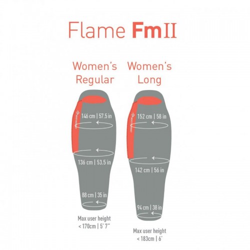 Sacii de dormit din gama Sea to Summit - FLAME sunt conceputi dupa doua criterii esentiale: functionalitate si confort. Acestia iti acopera toate nevoile, incepand de la lenjerii foarte usoare pana la saci pentru expeditii in mijlocul iernii.  Gama Flame este dedicata in intregime anatomiei feminine, fiind o gama special croita pentru acestea si ofera o calitate superioara multumita izolatiei din puf de gasca premium RDS 850+ Loft, fermoarelor YKK si invelisului protector din nailon 10D, alaturi de captuseala fina 7D. Modelul Flame FmII - Women's Long utilizeaza cu succes designul tip mumie cu scopul de a eficientiza confortul termic al utilizatorului, in timp ce tratamentul ULTRA-DRY creeaza o bariera protectoare intre puf si umezeala, crescand rezistenta acestuia la apa si condens, eliminand astfel efectele negative pe care umezeala le are asupra pufului. Toti sacii de dormit marca Sea to Summit contin puf cu certificare RDS, ce garanteaza faptul ca acesta provine din surse sigure si verificate. Indiferent ca te pregatesti de o expeditie alpina sau de o aventura in care nu stii ce te asteapta, sacul de dormit Flame FmII - Women's Long este o alegere buna atunci cand fiecare gram conteaza iar tu nu vrei sa renunti nici la confort. Recomandat pentru expeditii usoare, camping, refugii. model special conceput pentru femei izolatie termica din puf de gasca 850+ puf premium LOFT (650cuin), de o calitate superioara ce ofera un confort termic deosebit raportat la o greutate scazuta puf cu tratament Ultra Dry ce creeaza o bariera protectoare intre puf si umezeala si creste rezistenta acestuia la apa si condens eliminand, astfel, efectele negative pe care umezeala le are asupra pufului cusaturi speciale pentru optimizarea confortului termic tratamentul Ultra Dry se mentine cel putin 14 spalari invelis protector 7D, UL 10D, UL 15D ce consta intr-un material performant cu densitate medie, respirabil si durabil, ce are proprietati de compresibilitate bune certificare RDS pentru puf ce provine din surse de incredere, verificate, ce respecta drepturile animalelor fermoare YKK include sac de compresie Ultra-Sil pentru o depozitare usoara compozitie materiale: invelis din 100% nailon, captuseala din 100% nailon, izolatie principala: puf de gasca 90%, saculet pentru depozitare: 100% nailon (fara cusaturi) include standardul european EN13537 pentru evaluarea corecta a temperaturii din interiorul sacului de dormit cusaturi verticale in zona pieptului ce optimizeaza pozitia pufului la interior si mentin confortul termic inaltime utilizator recomandata: 183 cm dimensiuni sac impachetat: 15cm x 35 cm volum sac impachetat: 3.8L volum sac de compresie: 3.3L - 1.3L greutate totala: 575 de grame circumferinta la interior, in zona pieptului: 152 cm circumferinta in zona coapselor, la interior: 142 cm circumferinta la interior, in zona picioarelor: 94 cm temperatura de confort: 2 grade temperatura limita inferioara: -4 grade