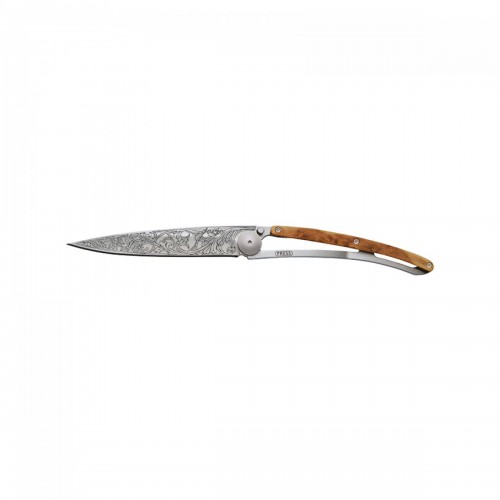 Briceag ultra-usor din otel inoxidabil 420, finisaj din titan. Lama decorata prin gravura cu laser. Clema pentru curea. Maner solid din lemn de ienupar. material: inox (otel inoxidabil) dimensiuni(inchis): 11 x 0.9 cm  lungime lama: 9.5 cm lungime briceag deschis: 20.5 cm greutate: 37 grame