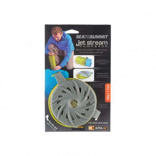 Jet Stream este o pompa pentru eficienta pentru saltele, care functioneaza si ca sac de compresie pentru anumite saltele. Multiple porturi uni-directionale umplu pompa cu aer cand aceasta se extinde. Cand se comprima, acest aer este introdus in saltea prin valva centrala. Fiecare compresie reprezinta o doza de aer echivalenta cu aerul expirat din plamani intr-o suflare.  Jet Stream are un volum redus la depozitare sau poate fi folosita ca sac de compresie pentru salteaua ta gonflabila sau alt echipament. baza din poliuretan termoplastic este usoara si are bucle pentru degete pentru a facilita actiunea de umflare porturile uni-directionale de admisie a aerului sunt dispuse in jurul valvei centrale realizata din poliester 30D Ultra-Sil greutate: 48 grame