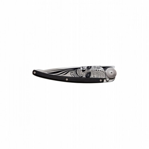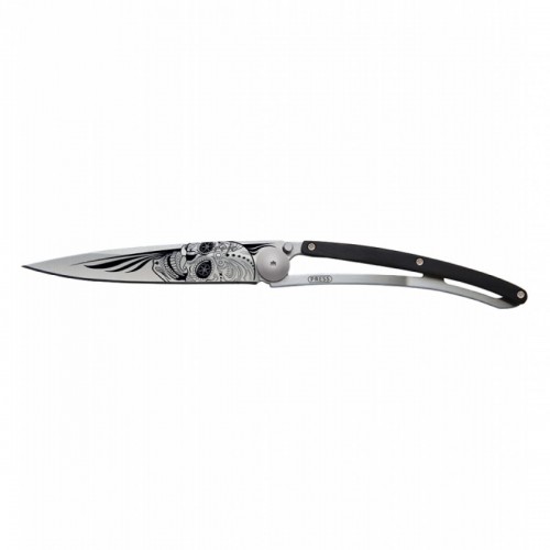 Briceag ultra-usor din otel inoxidabil 420 placat cu titan. Lama decorata prin gravura cu laser. Clema pentru curea. Maner solid din lemn de abanos. material: inox (otel inoxidabil) dimensiuni: 11 x 0.9 cm  lungime lama: 9.5 cm lungime briceag deschis: 20.5 cm greutate: 37 grame