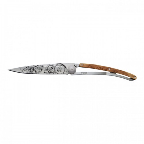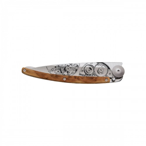 Briceag ultra-usor din otel inoxidabil 420, finisaj mat. Lama decorata prin gravura cu laser. Clema pentru curea. Maner din lemn de ienupar.  material: inox (otel inoxidabil) dimensiuni: 11 x 0.9 cm  lungime lama: 9.5 cm lungime briceag deschis: 20.5 cm greutate: 37 grame