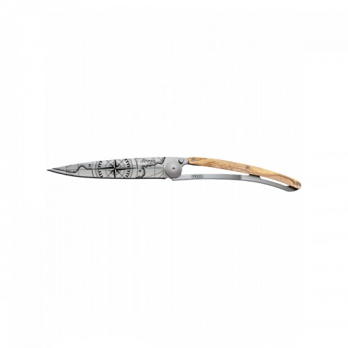 Briceag ultra-usor din otel inoxidabil 420, finisaj din titan. Lama decorata prin gravura cu laser. Clema pentru curea. Maner solid din lemn de maslin. material: inox (otel inoxidabil) dimensiuni(inchis): 11 x 0.9 cm  lungime lama: 9.5 cm lungime briceag deschis: 20.5 cm greutate: 37 grame