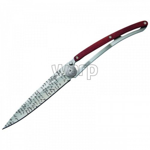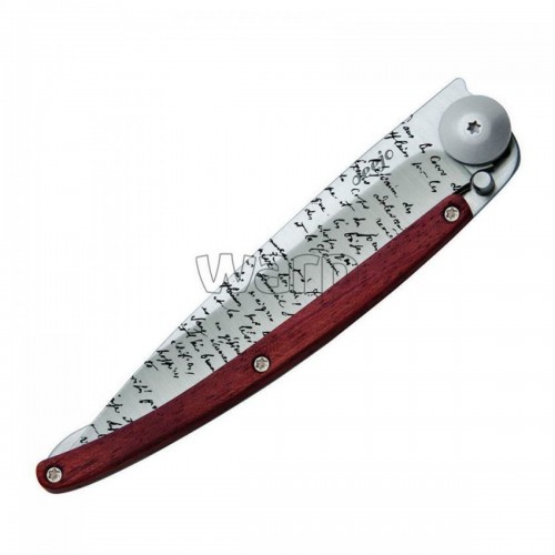 Briceag ultra-usor din otel inoxidabil 420, finisaj din titan. Lama decorata cu text caligrafic, prin gravura cu laser. Clema pentru curea. Maner solid din lemn de coral. material: inox (otel inoxidabil) dimensiuni(inchis): 11 x 0.9 cm  lungime lama: 9.5 cm lungime briceag deschis: 20.5 cm greutate: 37 grame