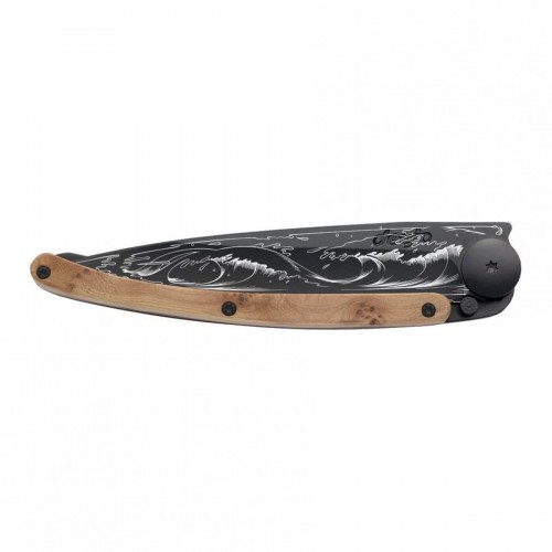 Briceag ultra-usor din otel inoxidabil 420, finisaj mat. Lama decorata prin gravura cu laser. Clema pentru curea. Maner din lemn de ienupar.  material: inox (otel inoxidabil) dimensiuni: 11 x 0.9 cm  lungime lama: 9.5 cm lungime briceag deschis: 20.5 cm greutate: 37 grame